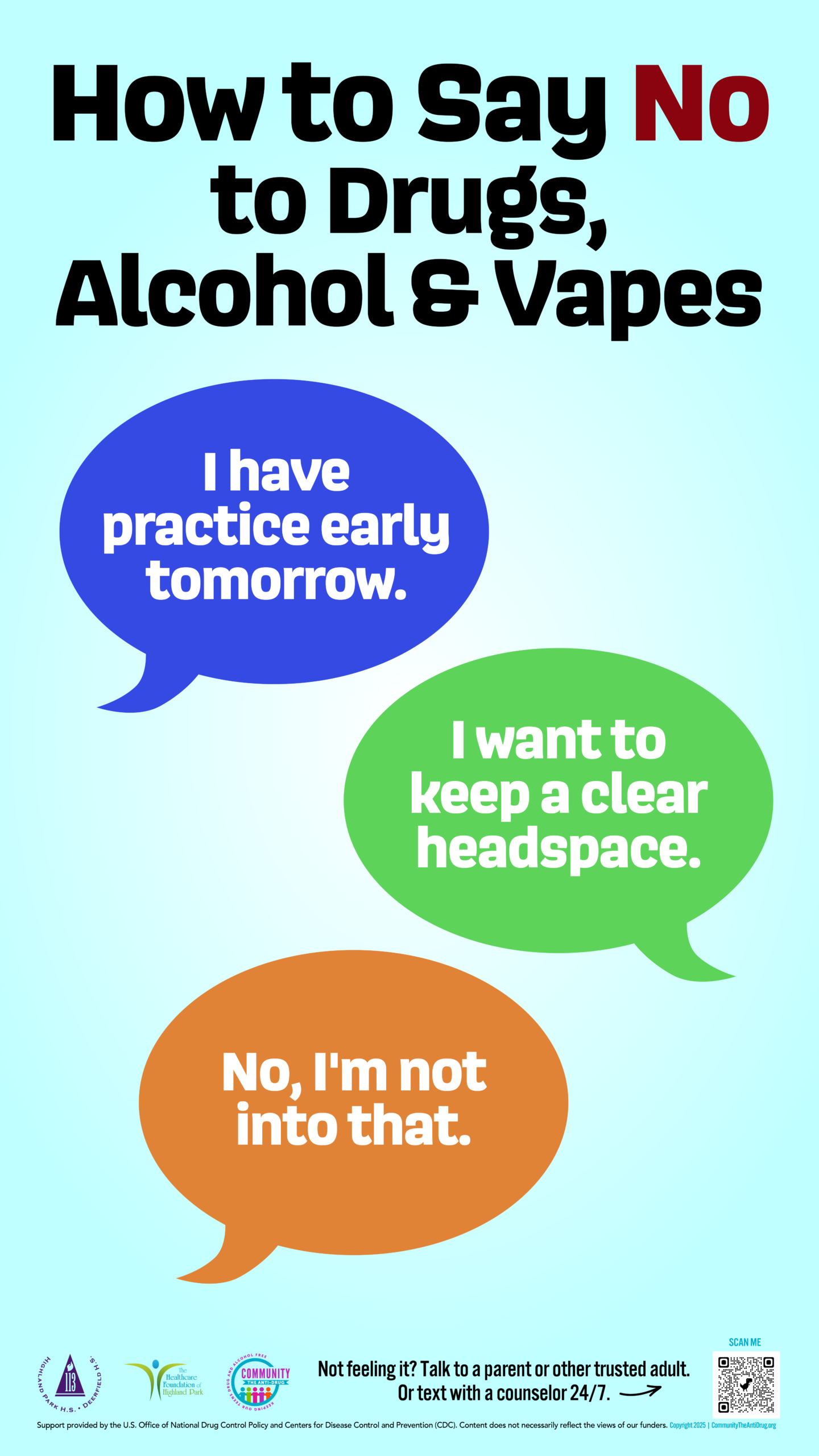 The Most of You awareness campaign highlights reasons DHS & HPHS students choose not to drink alcohol or use marijuana. Students in the drug prevention club Delta identified 11 reasons and then surveyed over 500 classmates to determine the top five. Each poster highlights one of these reasons: to keep their body healthy, to follow the law, to stay in control, to perform their best and to be a good role model. Additionally, each ad includes statistics showing that a majority of students are drug-free, think alcohol/marijuana is harmful, wrong to use, and not considered cool. In an effort to support students’ mental health, each poster also includes a 24 hour text support line.